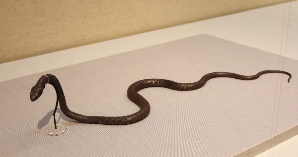 展示室の入口には自動で実際のヘビと同じように動く⦅自在蛇置物⦆の複製(令和5年(2025) 原品:宗義作 昭和時代・20世紀 東京国立博物館蔵)がありました。こちらもご注目!