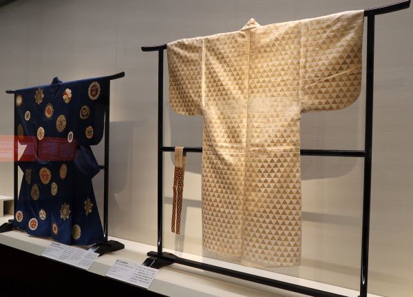 金の摺箔(すりはく)で正三角形を繋げた文様がヘビの鱗模様を表している能装束⦅摺箔 白地鱗模様⦆(右)。 能「道成寺」で、山伏への恋慕が執念となった娘は、大蛇に姿を変えて山伏のあとを追います。娘が鬼女の姿となった時に纏う装束です。