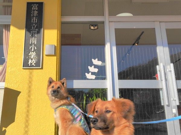 入口には、ここが小学校だったことがわかる看板があり、思わず愛犬たちと撮っちゃいました。