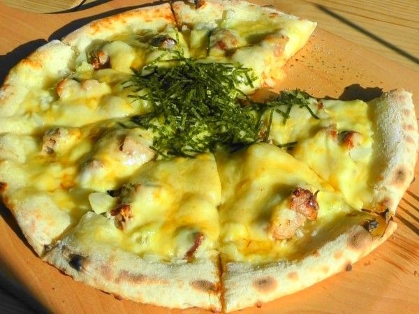 焼き立てのビザはチーズたっぷり。そしてトッビングには、チャーシューと海苔が。 そして食べてみると、チーズの下からシャキシャキ感のある玉ねぎが!!