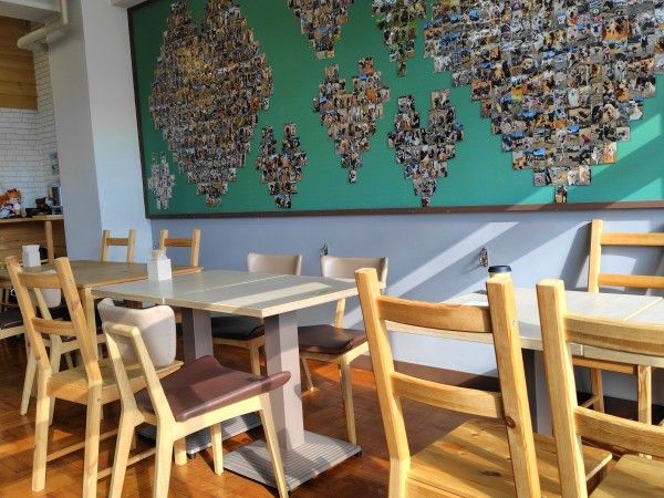 壁には、ドッグランなどで遊んでいるワンちゃんたちの写真がいっぱい貼られています。