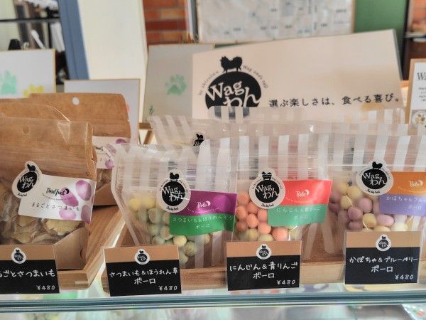 テレビ番組で紹介されている「とろなまバウム」をはじめ、愛犬とおいしいを共有できるワンちゃんのための「マメノキわんバウムクーヘン」、ボーロなどのおやつ類も並んでいました。