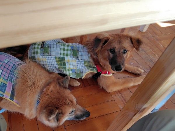 愛犬たちは、テーブルの下で伏せておりこうに待機しています。