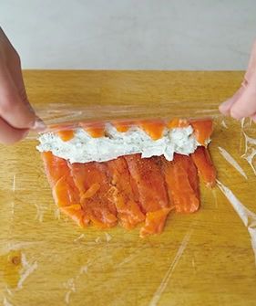 ラップを広げて敷き、スモークサーモンを縦に広げ、少しずつ重ねてのせる。黒こしょうをふり、手前にを横長に広げてのせる。スモークサーモンを手前からしっかりと巻き、ラップで包んで冷凍室に入れ、20分ほど冷やす。