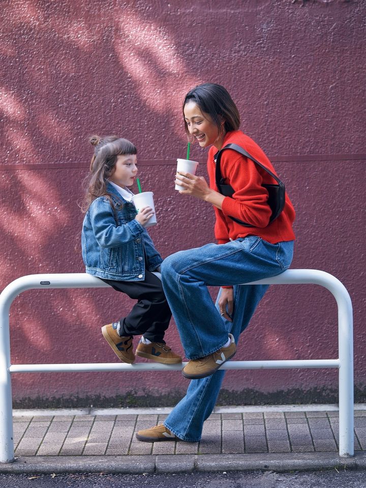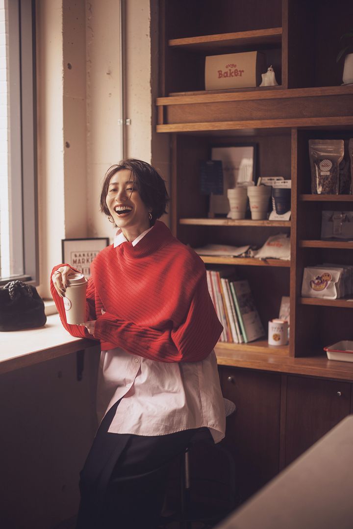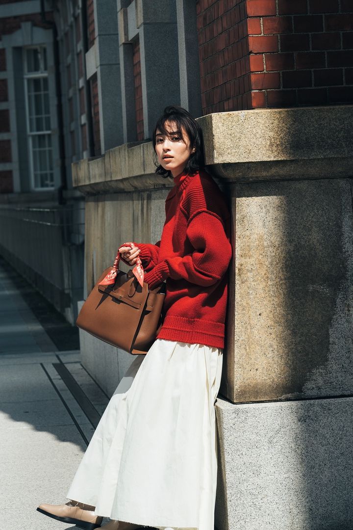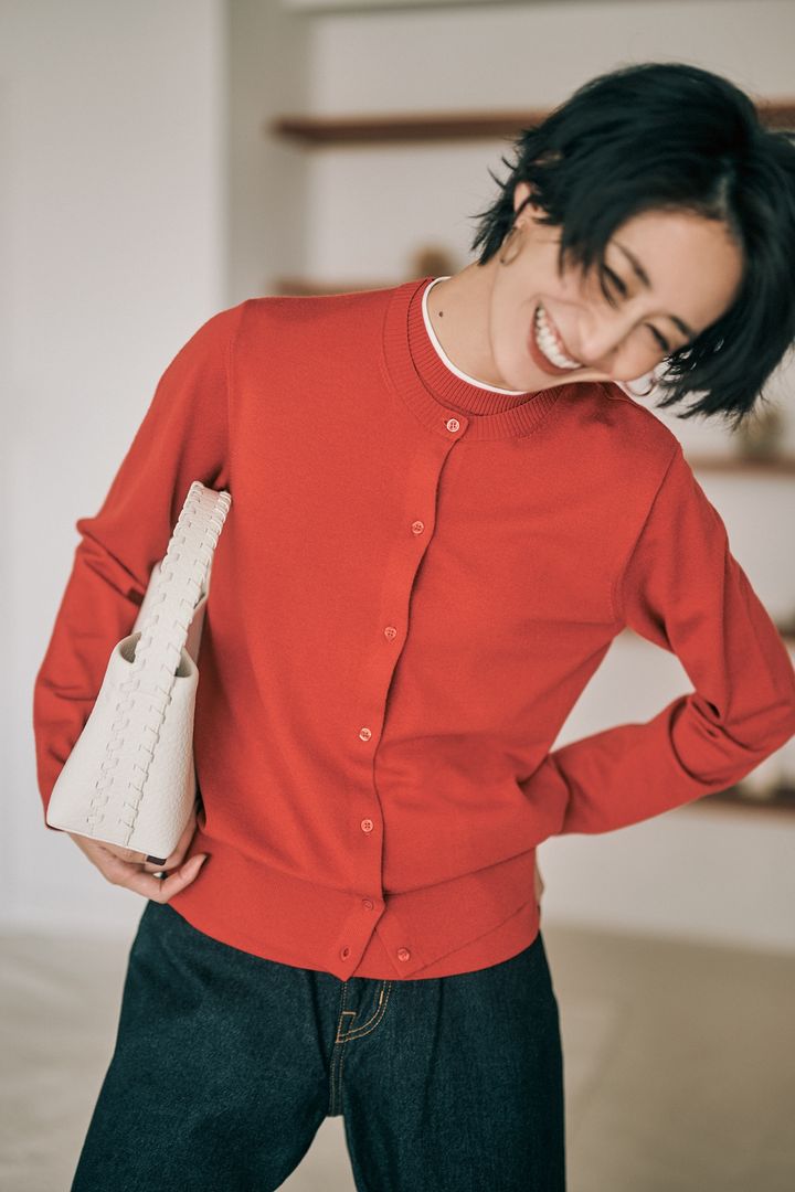 赤ニットとデニムは大人のトラッドが可愛く決まる組み合わせ。今年っぽくきれいめに着るなら濃紺のゆるデニムがおすすめです。明るめのブルーデニムを選べばよりカジュアルに。足元には、スニーカーやローファーなど、ボリュームのあるペタンコ靴を合わせるとバランスよく決まります。カーディガンはアンドドーター、デニムはSERGE、バッグはヤーキ、スニーカーはVEJAのもの。