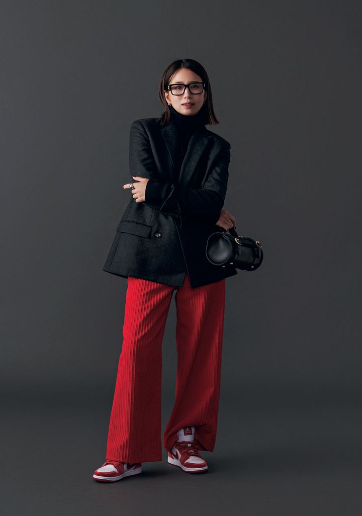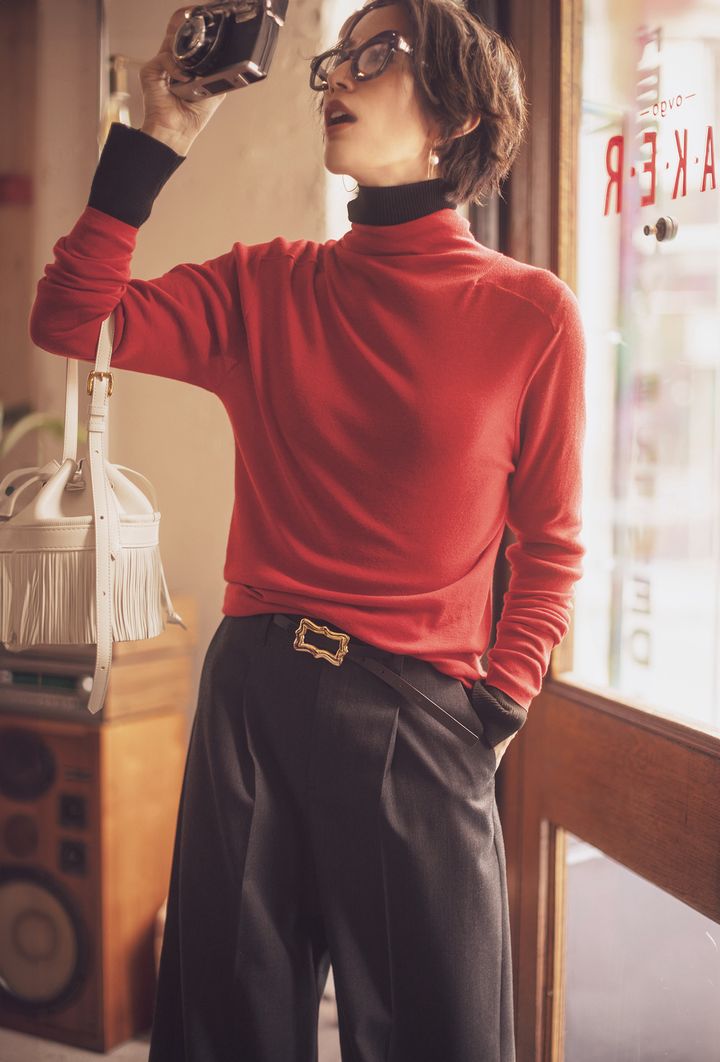 薄手のタートル同士を重ねる新鮮レイヤードコーデ。いつもの黒タートル感覚で着られ、上半身はコンパクトなシルエットを保てるのでワイドパンツとも相性◎。モコモコのアウターやダウンのインナーとしても役立ちそうなコーデです。赤ニットはエイトン、タートルニットはカデュネ、パンツはランバン オン ブルー、ベルトはア ヴァケーション、バッグはJ &M デヴィッドソンのもの。