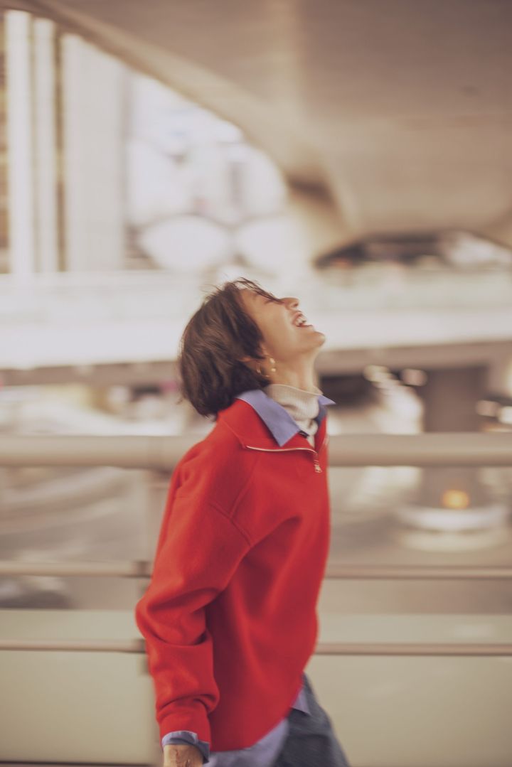 赤×ピンクの可愛げ配色は 重ね着でモードに寄せる