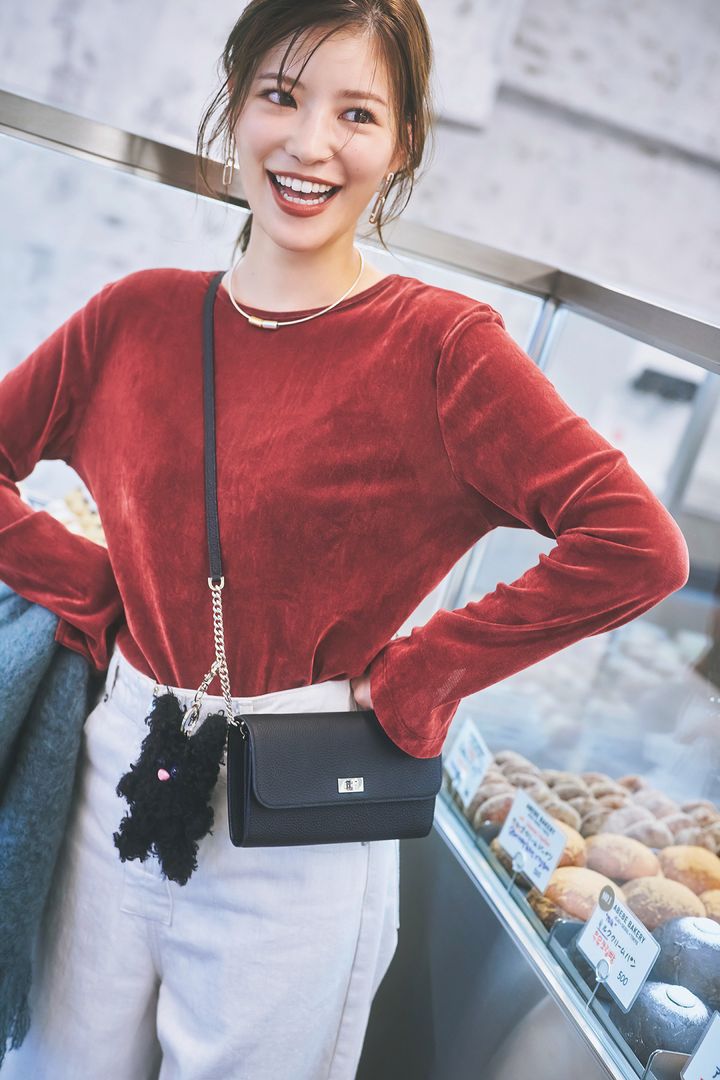 赤と黒は王道の色合わせですが、コントラストが強いので落ち着かないという人も。柔らかい印象にしたいならグレー合わせがおすすめ。ボトムスにグレーが入れば、アウターやバッグが黒でも重くなりすぎません。ニットはエンリカ、ブルゾンはマルティニーク、パンツはノーク、バッグはピエール アルディのもの。