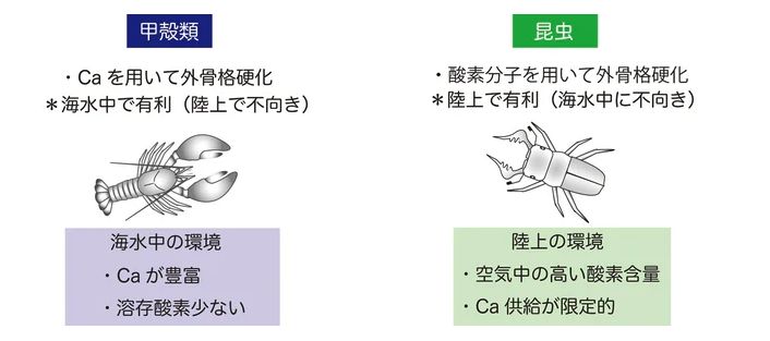 このように、酸素は豊富だがカルシウムが欠乏している「陸上」と、酸素は少ないがカルシウムが豊富な「海中」とでは、外骨格の作り方が大きく異なるのです。