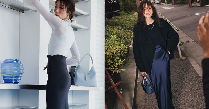 特有の艶と陰影が女っぽさを添えてくれるサテンスカートは、厚手の服が増える冬こそ有効。ヒップ下からキュッとくびれる、マーメイドシルエットが確実に細見えを狙えると定評があり、色ち買いする人も続出の名品。