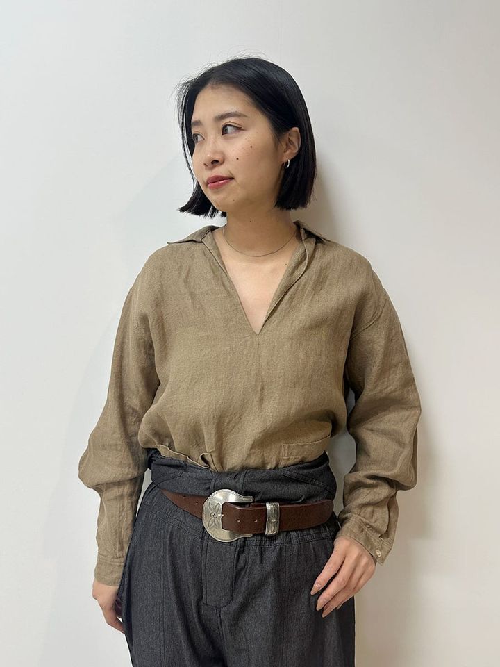 「中白染めのリネン生地で、ヴィンテージライクな表情も味があってお気に入りです」個性的なバックルもアクセントに。