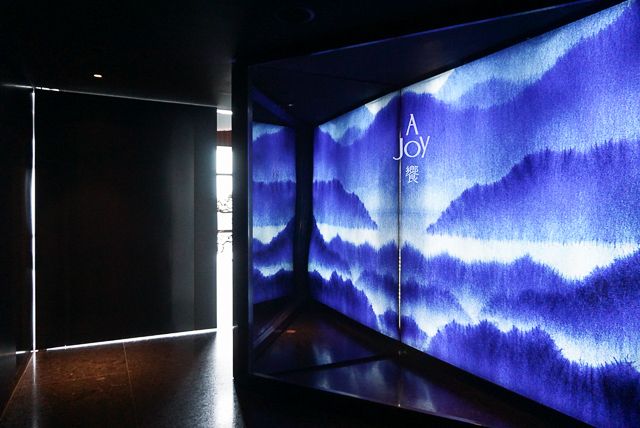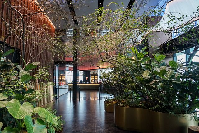 五感を刺激するさまざまな仕掛けや空間デザインも秀逸です。店に到着し、暗いエントランスを抜けると、山をイメージしたロビーエリアへ。