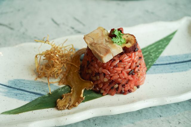 4種類の米を使い、ごま油で煮込んだ逸品。消化をよくするため、2種類の餅米に加えて玄米と赤米も加えたのがシェフのこだわりだそう。