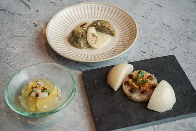 通常ならオリーブやパセリを加えることの多いフレンチメニュー「豚足のジュレ」を、青唐辛子の漬物やパクチーを使ってローカライズさせたメニュー。台湾で冬季によく食べられる皇帝豆で作ったペーストがソースとして添えられています。