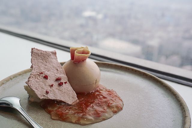 そして目玉は、注文してから目の前で作ってもらえるプレートデザート。2つのスイーツ店とコラボレーションして開発されたオリジナルメニューです。フランス菓子店「法朋 Le Ruban Pâtisserie」とコラボレーションした「嫣紅」は、グァバムースにロマージュブランアイスクリーム添えた甘酸っぱいひと皿。薔薇の花びらシロップを加えることで、華やかな香りがただよいます。