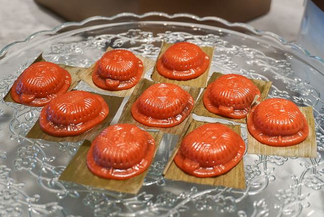 もち米で作った真っ赤な生地に小豆餡を詰めてカメに似た形にする台湾の伝統菓子「貝比紅龜粿(ミニ紅亀ケーキ)」も並んでいます。従来のサイズ感よりかなり小さくアレンジされているので、観光客でもチャレンジしやすいですね。パイナップルケーキや龍の髭もありました。