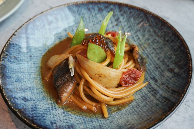 台湾の麺料理をモデルに、イタリアのブカティーニ(中心に穴のあるパスタ麺)で洋食メニューにアレンジされたアナゴのパスタ。砂糖、葱、ワインを炒めたソースに、まるでイクラのような酢ボールが特徴的です。