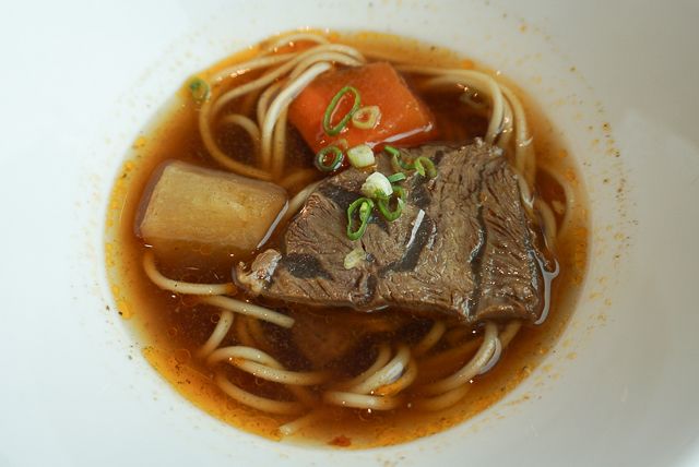 豚骨、牛肉、大量の野菜を8時間以上煮込むことで、食材から出たうま味をしっかり感じられます。ネギの名産地、宜蘭地方で採れた「三星葱」をのせて。