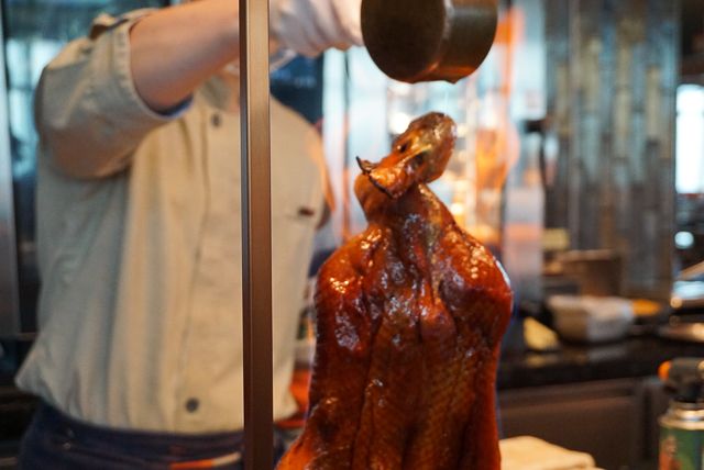 塩を加えて一晩寝かせ、砂糖と赤酢を塗って高温で焼きあげた北京ダック。ビュッフェカウンターでフランベの様子を見ることができます。