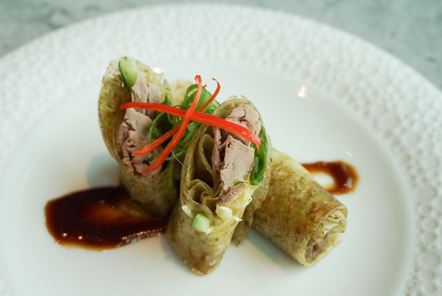 「火焰片皮鴨捲(ダック春巻き)」は、葱を使用した手作りの皮でレタス、きゅうり、葱と一緒に巻かれています。中華料理の調味料である甘麺醤(テンメンジャン)を炒めることで、香り豊かなソースに仕上げたそう。