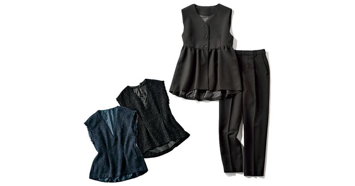 高級感のあるダブルクロス生地を使用。インに合わせるもの次第で、シンプルも甘めも自在に楽しめるペプラムジレとパンツのセット。