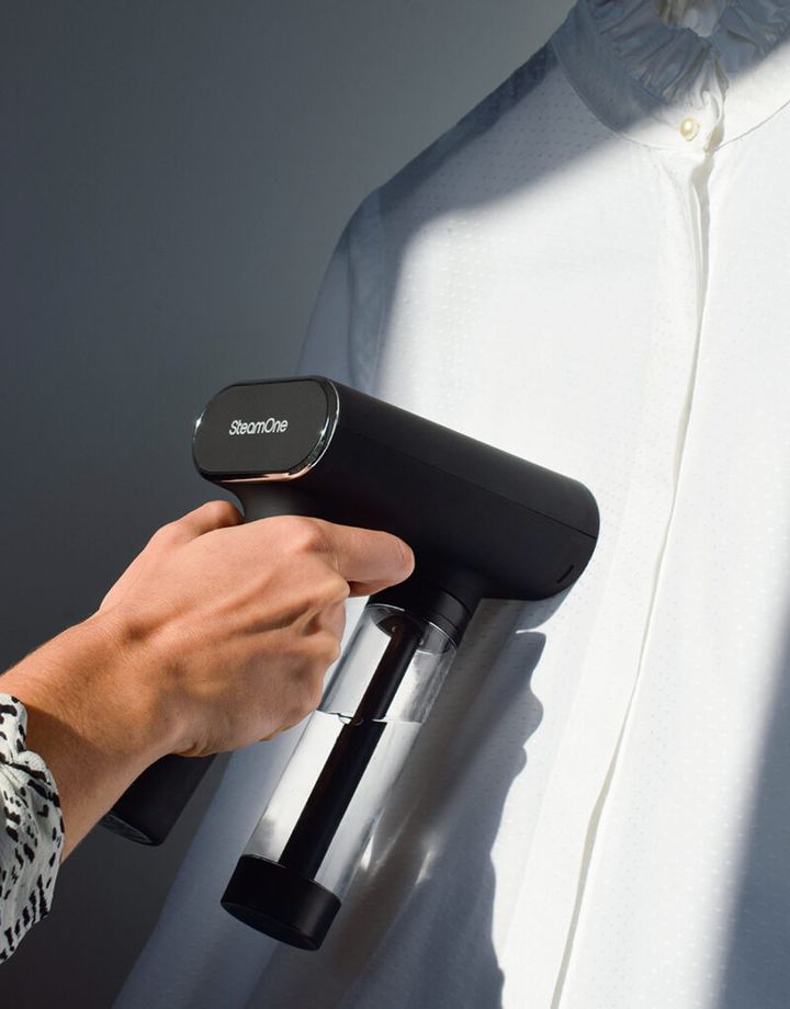 「フランスの衣類スチーマーメーカーが手掛けた洒脱なデザイン。スチーム量が多いので、1ストロークでシワが伸び、自立型で置き場所を選ばず、トリガーを押すだけの簡単操作も魅力」(前田さん)