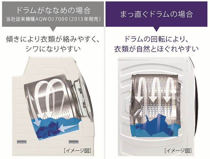 まっ直ぐドラムは傾きのない回転のため、衣服がほぐれやすくシワになりにくい。