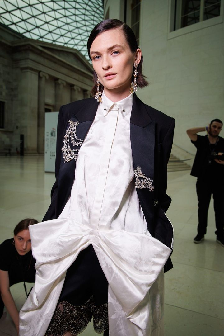 ロンドンを拠点とする同ブランドの2025年春夏コレクションでは、アメリカでファッションやカルチャーが大きな盛り上がりを見せた「狂騒の1920年代(Roaring Twenties)」を彷彿させるドロップウエストのシルエットや、当時のウィメンズウェアとメンズウェアを融合させたデザインが特徴的だった。