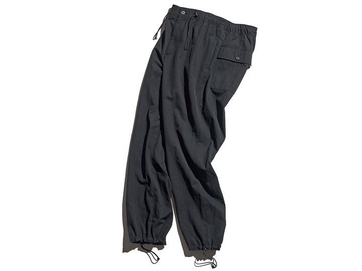 ワイドながらも洗練されたシルエットと、スピンドルで絞れる裾が生み出す足元のメリハリ。そして天然繊維を彷彿させるテック生地の風合いが相まって、すこぶる大人顔。