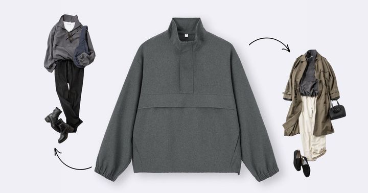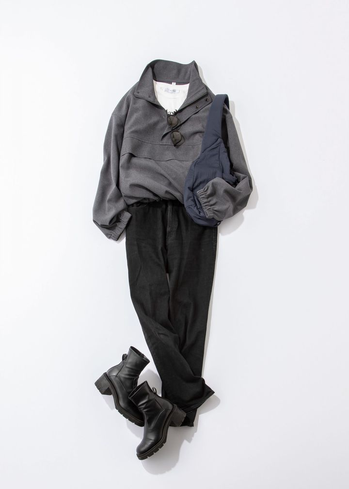 メンズアイテムならではのゆったり感が可愛らしいハーフジップブルゾン。さらっとしたキレイめ素材で、カジュアルになりすぎず、コンサバ派も難なくトライできます。裾のドローコードをキュッと絞れば、丸み帯びたコクーンシルエットに早変わり。首元はスナップボタンが3つ付いていて、上まで閉じるとスタンドネックになります。左右のポケットに加え、フラップ部分の下にもファスナー付きのビッグポケットあり。洗濯機洗い可。ハーフジップブルゾン[07 GRAY]¥3,990(GU)※オンラインストアおよび一部店舗のみ販売