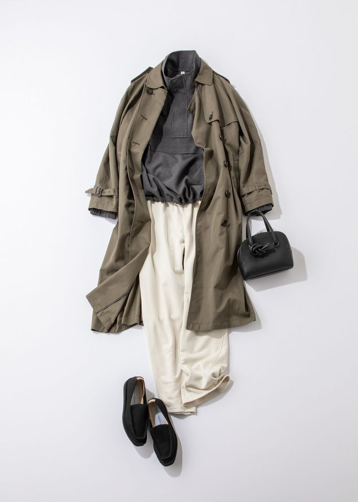 ブルゾンの首元は上まで閉めてきちんと感を演出。さらにトレンチコートを羽織れば、より全体のキレイめ度がアップして、大人に相応しい装いに。ブルゾン、パンツ(ともにGU)その他・ライター私物