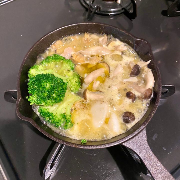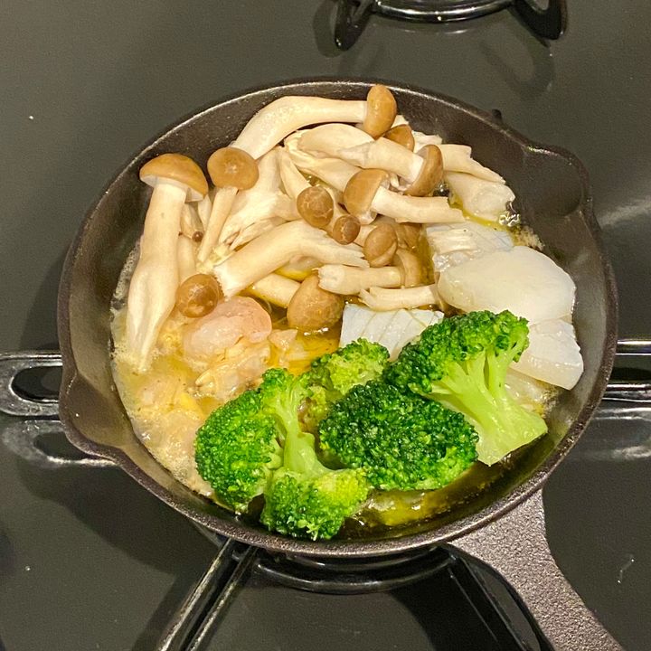 出典:MORE④好きな海鮮や茸を入れます。 イカ、エビ、ブロッコリー、しめじを入れました。