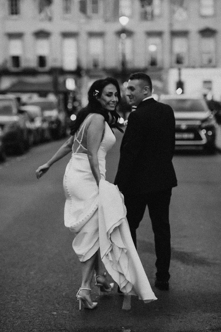 私はプロノビアスのアイボリーサテンのウエディング・ドレスをインスタグラムで見つけ、たちまち「これだ」と思いました。ミニマルですが、脚にスリットが入っていて、オープンバックにビーズのついたストラップが交差している、レッドカーペット級のドレスです。カテドラル・トレーンにボタンをつけて、ちょっとしたアクセントを足しました。地元のブライダルショップでオーダーし、何回かフィッティングをすると、準備OK。全体的に比較的簡単に進みました。