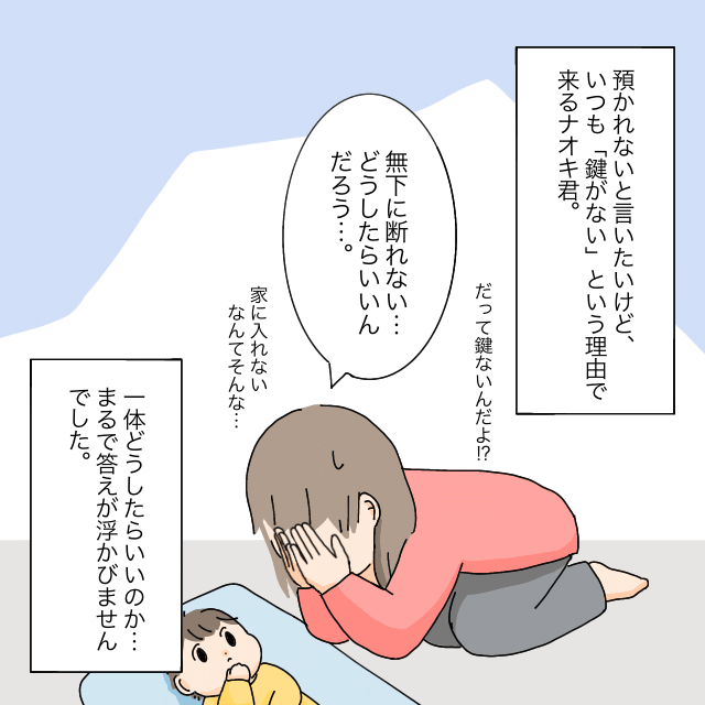 本当は『預かれない』と言いたいけど、いつも『鍵がない』という理由で来るナオキくんを思うと、「無下に断れない・・どうしたらいいんだろう・・」と考え込んでしまうママ。一体どうしたら良いのか、まるで答えが浮かびませんでした。