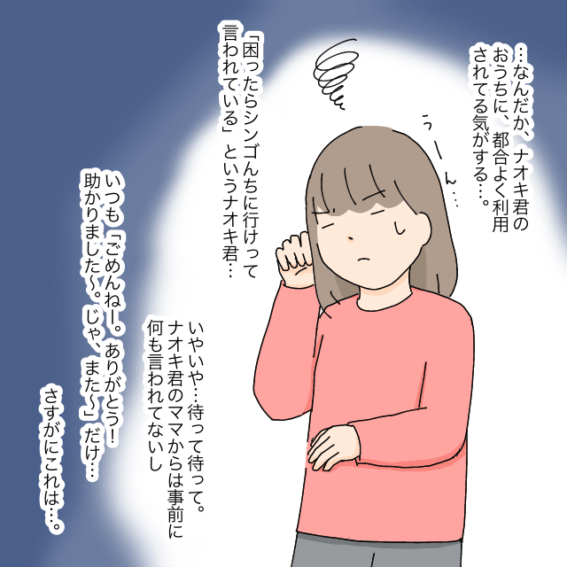 あまりに頻繁にナオキくんが家に来るようになったため、「うーん・・なんだか、ナオキくんのおうちに都合良く利用されてる気がする・・」と考えるようになったママ。「『困ったらシンゴんちに行けって言われてる』というナオキくん・・いやいや、待って待って。ナオキくんのママからは事前に何も言われてないし」「いつも『ごめんねー。ありがとう!助かりました~。じゃ、また~」だけ・・さすがにこれは・・」と思い悩んでいました。