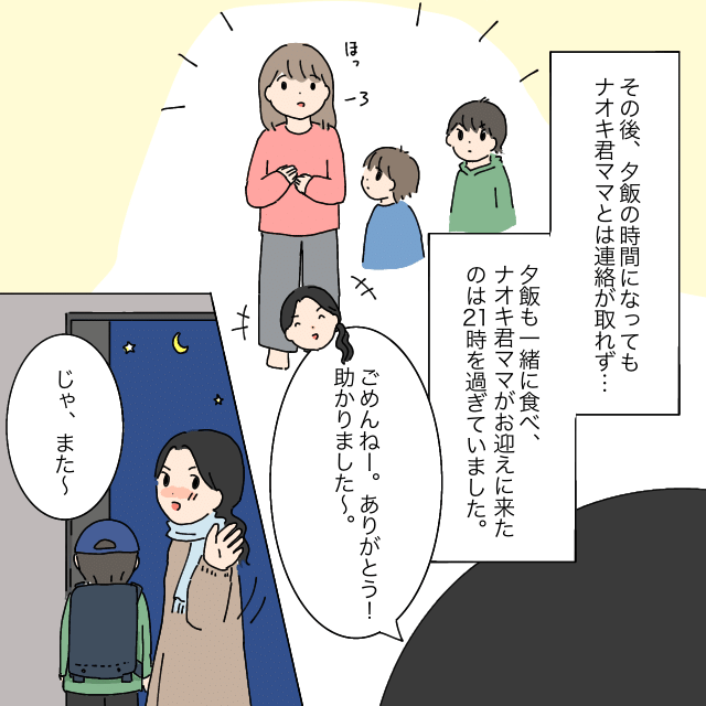 その後、夕飯の時間になってもナオキくんママとは連絡が取れず・・夕飯も一緒に食べて、ナオキくんママがお迎えに来たのは21時を過ぎていました。「ごめんねー。ありがとう!助かりました~!じゃ、また~」全く悪びれる様子もなくそう言うと、ナオキくんと一緒に帰って行きました。