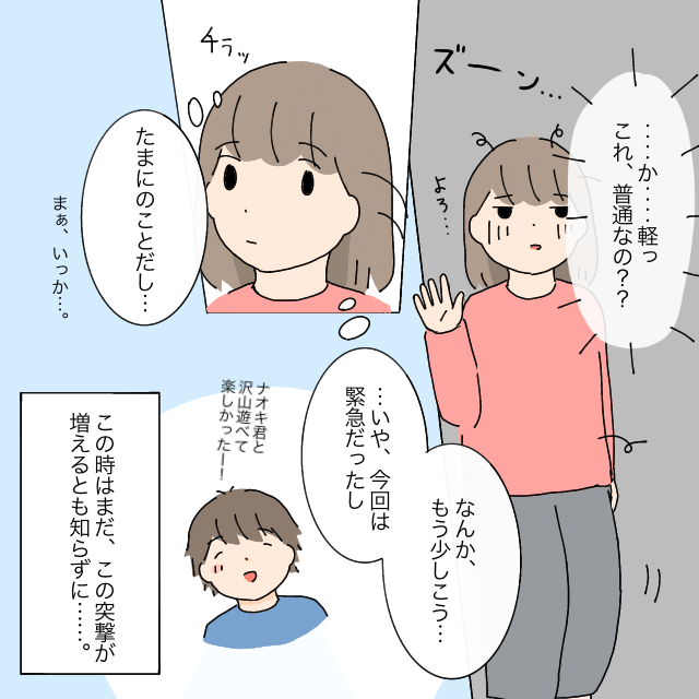 「・・か・・軽っ!これ、普通なの??なんか、もう少しこう・・」ママはそう思ったものの、シンゴくんが「ナオキくんとたくさん遊べて楽しかったー」とご機嫌だったこともあり、「いや・・今回は緊急だったし。たまのことだし・・まぁ、いっか・・」と心を落ち着けました。この時はまだ、この突撃が増えるとも知らずに。