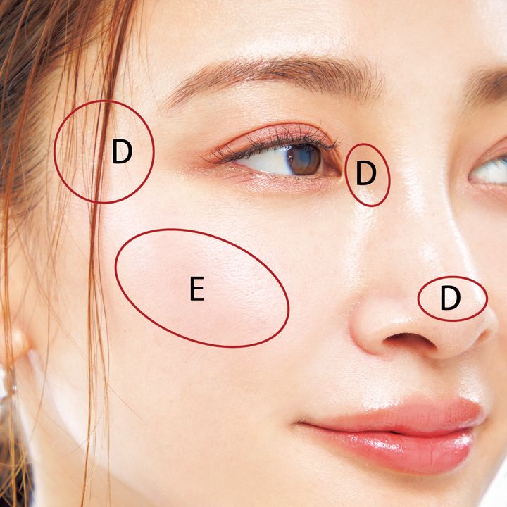Dを凹みが気になるこめかみにブラシでふんわり、鼻先と目頭に指でポンとのせる。Eをブラシで混ぜとり、頰骨上に斜めに入れる。