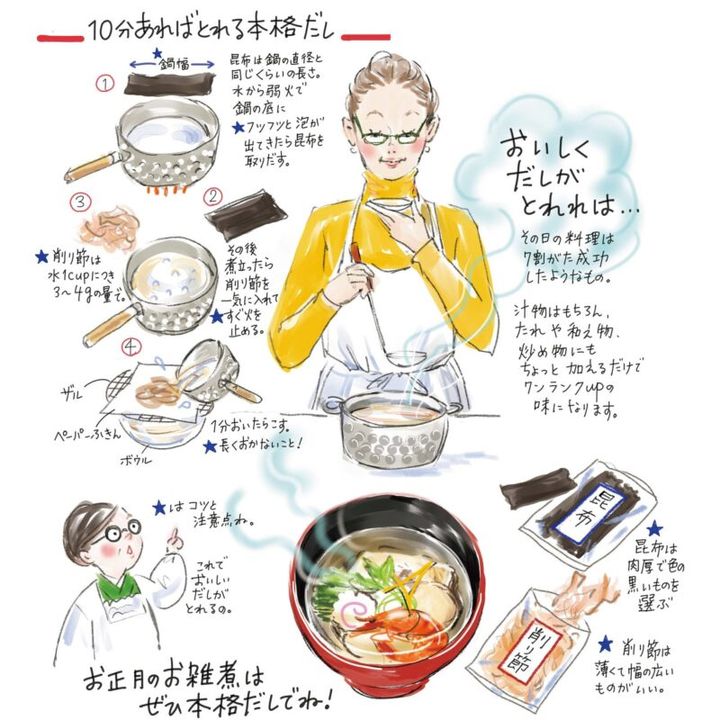 私が30代半ばだったころ、私たち世代はまだバブルの余韻を残し、なにもかもが滅茶苦茶忙しかった。そんなとき、仕事先の編集者さんとの打ち合わせ終わりに、家庭料理についての雑談をした。 「きちんとだしをとってまでごはんを作れないですよねぇ」と、私は自分の日常を口にして軽く共感を得ようとしたら、「うちはとっているんですよ〜」と軽く答えが返ってきた。ものすごく忙しいはずなのに、この人は仕事も食事も手抜きしないのか。私は急に恥ずかしくなった。 天然とか無添加というパッケージに安心して使っていた市販のだしパック。私は和食の基本であるだしも自分でとれないんだ。この思いはしばらくモヤモヤと続いた。40代に入って、和食に限らず日本のことをよく知らない自分がもっと恥ずかしくなり、茶道を習い始めた。お点前のお稽古というより、日常を慈しむことの大切さが身にしみて、日々の食事を見直したくなった。 「日本料理を習おう!」基本が勉強できればそれでいいやと習い始めた料理教室は、結局10年続いた。その基本から生まれる滋味深い味わいに、私の胃袋が通い詰めたのだ。やはりきちんと手をかければきちんとおいしいものができる。その後、わが家の食生活は大いに変わった。 ときどき、友達から「いまさらほかで聞けないんだけど、だしってどうやってとるのが正解?」と聞かれることがある。地方によっても好みによってもだしはさまざまだから正解はないけど、基本に忠実にとればいいだけよ。ただし日常的にね。実のところ日本のだしは、どこの国のスープよりも短時間で誰にでも作れるもの。こんなに簡単で、食事がおいしくなるものを日常的に自分で作らないのはもったいないと思うのだ。 イラスト・文/植草桂子