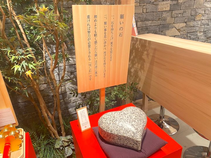 ぜひ体験してもらいたいのが、「願いの石」での願掛けです。はじめにハートの形をした石を両手で持ち上げて重さを覚えます。