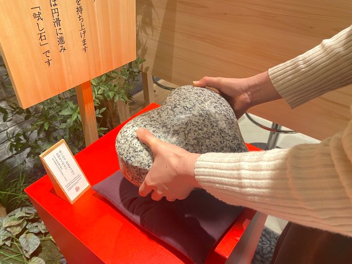筆者も実際に体験! 重さを覚えてから、願い事をして再度持ち上げてみると「あれ?さっきよりも軽いかも…」。