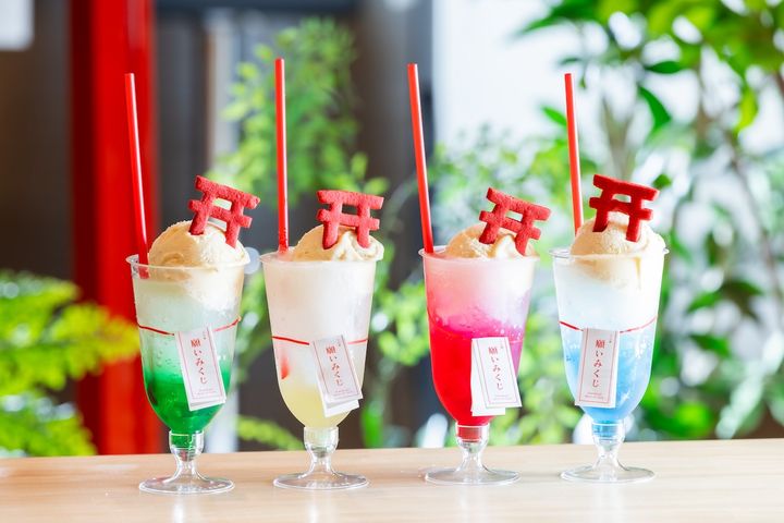 境内のような店内では、縁起がいいスイーツや体験を楽しめます。従来の神社のイメージを覆すようなカラフルでキュートな盛り塩などのアイテムも販売。今年のゲン担ぎにもぴったりなカフェをぜひ楽しんでみて!