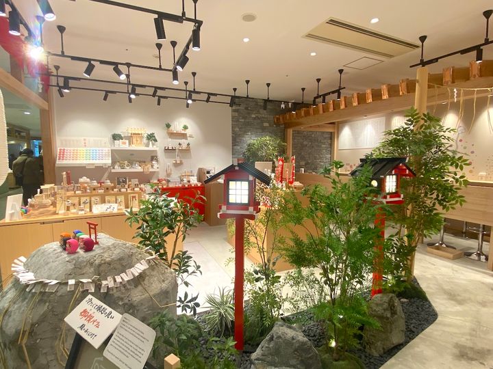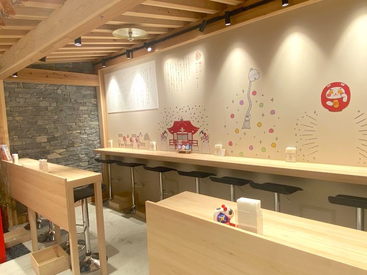 店内は神社をイメージしてデザインされており、大きく分けると飲食のできるイートインスペースと縁起のいい体験や商品の購入ができる2つのスペースがあります。