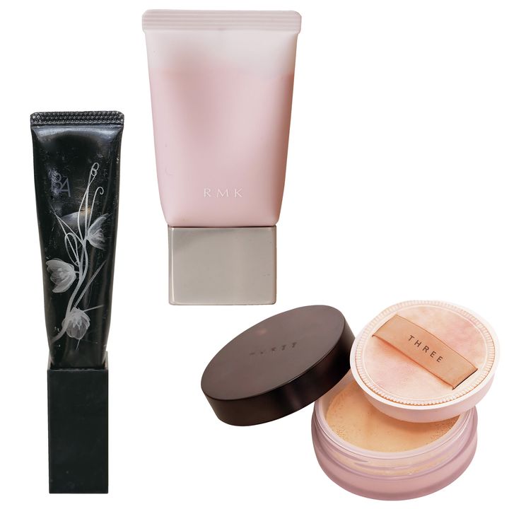POLAのB.Aコンシーラー02は塗っても重たくないのに自然にクマや赤みを消してくれます。RMKのコントロールカラーは透明感の出る02をセレクト。THREEのパウダーは小田切ヒロさんが紹介していたのを見て02を購入。ツヤを消さず仕上がるので、肌がキレイなんです。