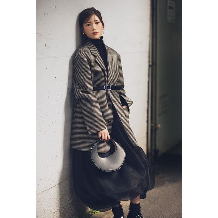 ビッグジャケット¥135,300(ザ・リラクス)タートルニット¥27,500(スローン/ザ ショップ スローン 新静岡セノバ店)バルーンスカート¥61,600(THE GARMENT/メゾン イエナ)イヤリング¥5,400(アビステ)ベルト¥14,300(TELA/ティースクエア プレスルーム)バッグ¥96,800(ネイータ/オデット エ オディール 新宿店)ソックス/スタイリスト私物