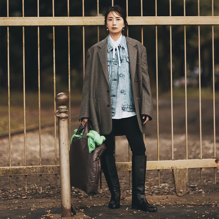 ジャケットは着回し。デニムジャケット¥49,500(サードマガジン)シャツ¥17,600(スピック&スパン/スピック&スパン ルミネ有楽町店)パンツ¥24,200(ダブルスタンダードクロージング/フィルム)ピアス¥26,400(モニス/フォーティーン ショールーム)トートバッグ¥66,000〈KASSL EDITIONS〉グリーンカーディガン¥14,300〈ジャーナル スタンダード〉(ともにジャーナル スタンダード 自由が丘店)ブーツ¥50,600(ユナイテッドアローズ/ユナイテッドアローズ 六本木ヒルズ店)