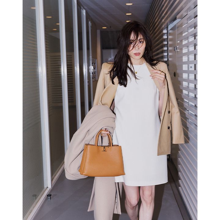 ワンピース¥39,600ジャケット¥64,900(ともにセオリー/リンク・セオリー・ジャパン)コート¥36,300(ステートオブマインド/ゲストリスト)バッグ¥391,600(トッズ/トッズ・ジャパン)ピアス¥178,200ネックレス¥173,800(GIGI/ホワイトオフィス)リング〈右手〉¥37,400(メゾンヴァジック/ヴァジックジャパン)リング〈左手〉¥20,900(アイソレーション)