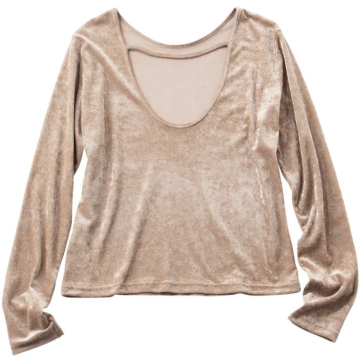 ベロアの光沢や背中のストラップも女っぽさを高めるのに一役。 ベロアカットソー¥7,590(ココ ディール)