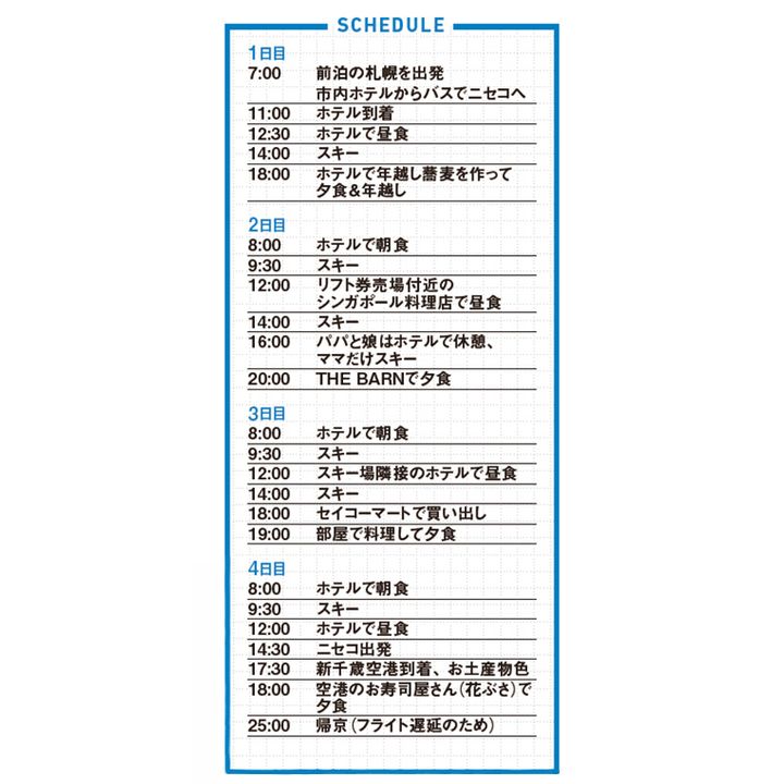 子どもの体調管理が最重要事項。旅行中でも普段通りの早寝早起きに徹しました。また、室内外の寒暖差が激しいため、スキーの直後や、汗をかいたら着替えをさせるなど、環境の変化で体調を崩しやすい子どもの健康管理は入念に!が我が家の旅先でのルールです。