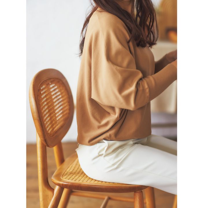 姿勢を正そうとすると反り腰になってしまう人が多いですが、反り腰は背中の張りや凝りの原因になるので、頭の先から真っ直ぐに座ります。お尻の丸みが潰れないよう骨盤を立てて座り、その上に背骨が乗るイメージで。